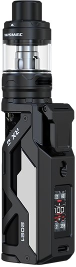 Po dlouhé odmlce se tradiční výrobce Wismec opět hlásí o slovo, a to ve futuristickém a dech beroucím stylu. REULEAUX RX G se prezentuje kyberpunkovým designem s barevně osvětleným tělem baterie. Konstrukce gripu je vyrobena ze slitiny zinku a nachází se na něm tři důležitá tlačítka - spínací tlačítko, uzamykací tlačítko proti nechtěném spuštění a regulační tlačítko pro pohodlné nastavení hodnot, které jsou zobrazeny na 0,96palcovém displeji. Nastavitelný výkon dosahuje až 100W s možností automatického nastavení dle odporu žhavící hlavy. Tato sada obsahuje clearomizer RX G s novými žhavícími hlavami WX, které využívají inovativní ocel AST pro zvýraznění chuti. Využívá systém horního plnění - po odsunutí vrchní části plníte liquid otvorem přímo do těla clearomizeru o objemu 4,7ml. Celý clearomizer je plně rozebíratelný (snadná údržba). Regulace přívodu vzduchu pro nastavení optimální kouřivosti se nachází ve spodní části.